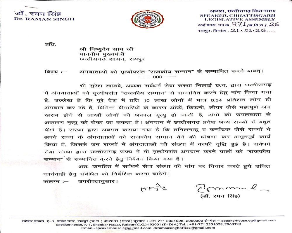 विधानसभा अध्यक्ष ने अपने पत्र में यह भी बताया कि सर्वधर्म सेवा संस्था, (छ.ग.) के अध्यक्ष श्री सुरेश खांडे द्वारा राज्य में मृत्योपरांत अंगदान करने वालों को राजकीय सम्मान दिए जाने की मांग की गई है, जिसे जनहित में अत्यंत महत्वपूर्ण बताया गया है।