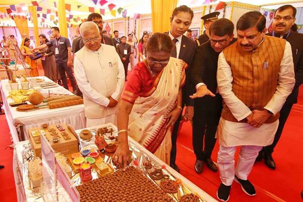 राष्ट्रपति श्रीमती द्रौपदी मुर्मु ने उज्जैन के ग्राम ढेंडिया में रुद्राक्ष होटल में स्वच्छता ही सेवा-2024 अभियान अन्तर्गत लगाई गई प्रदर्शनी का अवलोकन किया। राष्ट्रपति श्रीमती मुर्मु ने अनुपयोगी कपड़ों से नवजात बच्चों के लिए बनाई गई दुलार किट, नारियल के अपशिष्ट और गोबर से बनाये गये उत्पाद, सूखे कचरे का सही निपटारा कर बनाये गये बहुउपयोगी उत्पाद और श्रीमहाकालेश्वर मंदिर में अर्पित किए गये फूलों और निर्माल्य से बने उत्पाद, अगरबत्ती एवं अन्य उत्पाद बनाने की मशीन, निर्माल्य प्र-संस्करण, सफाई मित्रों के लिए सुरक्षा उपकरण एवं संसाधन और शून्य अपशिष्ट आयोजन के स्टॉल का अवलोकन किया।