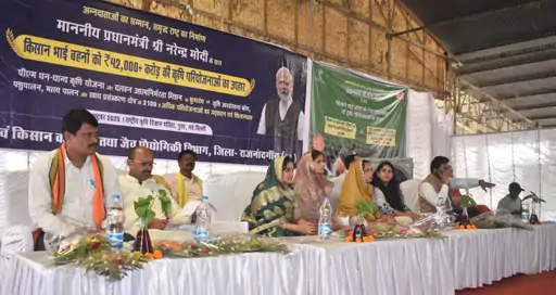 राजनांदगांव, प्रधानमंत्री नरेन्द्र मोदी द्वारा देश के किसानों की उन्नति के लिए प्रधानमंत्री धन.धान्य योजना तथा दलहन आत्मनिर्भरता मिशन का शुभारंभ नई दिल्ली से किया गया। इस शुभारंभ कार्यक्रम में जिले के किसान कृषि उपज मंडी परिसर से वर्चुअल माध्यम से जुड़े रहे। कार्यक्रम मुख्य अतिथि के रूप में उपस्थित जिला पंचायत अध्यक्ष किरण वैष्णव ने किसानों को रबी सीजन में दलहन.तिलहन फसलों का रकबा बढ़ाकर शासन योजनाओं का लाभ लेने तथा कम पानी व कम कृषि लागत वाली फसलों को लेकर ज्यादा मुनाफा वाली फसलों को लेने के लिए आग्रह किया।
