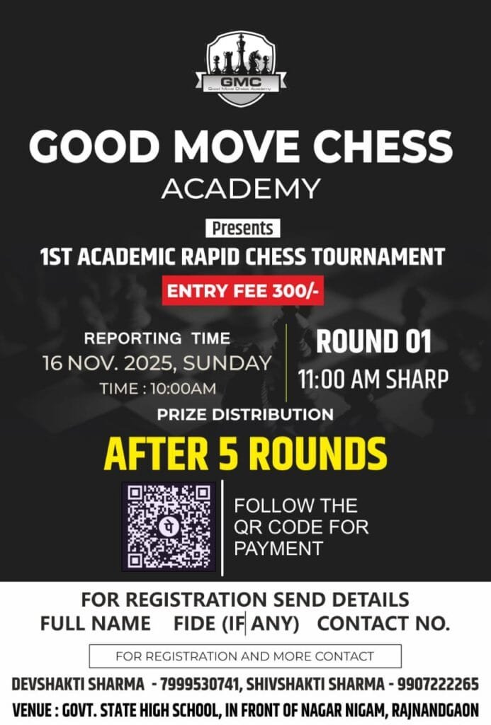 गुड मूव चेस अकादमी द्वारा 16 नवंबर को स्टेट हाई स्कूल में सुबह 11 बजे से 5 बजे तक एकेडमिक चेस टूर्नामेंट का भव्य आयोजन किया जा रहा है। इस आयोजन में अकादमी के सभी विद्यार्थी आपस में प्रतिस्पर्धा करते हुए अपनी प्रतिभा का प्रदर्शन करेंगे। टूर्नामेंट में अंडर-9 तथा ओपन कैटेगरी में शीर्ष 10 खिलाड़ियों के लिए आकर्षक पुरस्कार निर्धारित किए गए हैं।