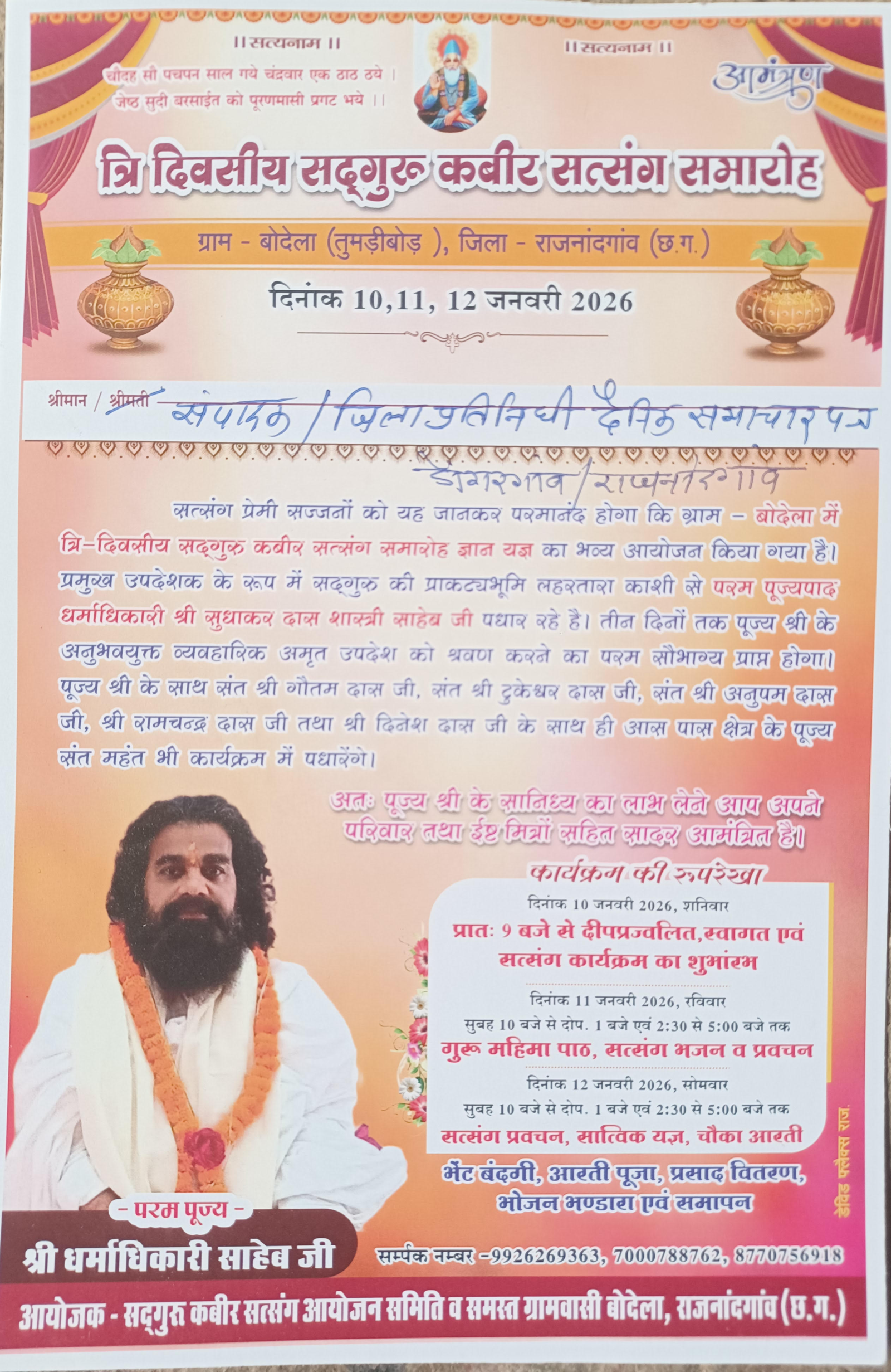 तुमडीबोड- समीपस्थ ग्राम बोदेला मे सद्गुरू कबीर सत्संग आयोजन समिति व समस्त ग्रामवासी के तत्वाधान मे 10 ,11 व 12 जनवरी को तीन दिवसीय सद्गुरू कबीर सत्संग समारोह ज्ञान यज्ञ का भव्य आयोजन रखा गया है। जिसमे प्रमुख उपदेशक लहरतारा काशी से परम पूज्य धर्माधिकारी सुधाकर दास शास्त्री साहेब होगे। इनके साथ संत गौतम दास जी, संत टुकेश्वर दास जी, संत अनुपम दास जी, संत रामदास जी, संत दिनेश दास जी सहित आसपास क्षेत्र के पूज्य संत महंत की उपस्थिती रहेगी।