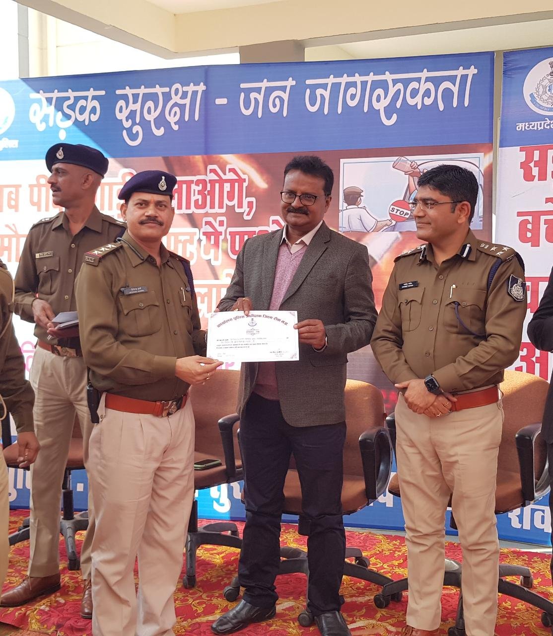 कंट्रोल रूम में सड़क सुरक्षा कार्यक्रम का आयोजन जिसमे जिला कलेक्टर मनोज पुष्प के कर कमलों से पुलिस अधीक्षक रीवा नवनीत भसीन द्वारा सिविल लाइन थाना प्रभारी हितेंद्र नाथ शर्मा चैन स्नैचिंग मैं उत्कृष्ट कार्य के लिए प्रशिक्षित पत्र देकर किया गया सम्मानित।