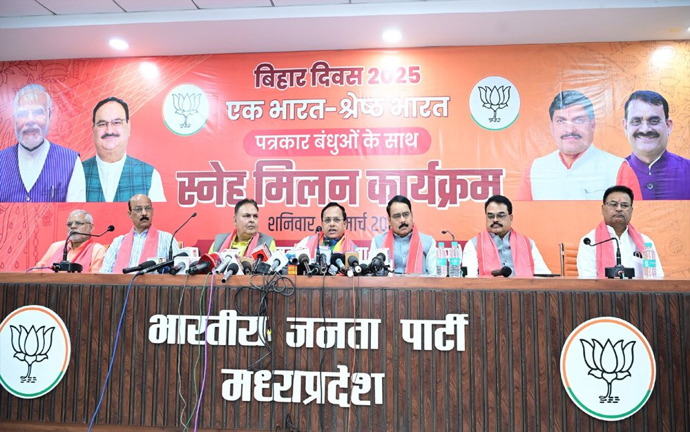 बिहार दिवस के अवसर पर चलाए जा रहे 9 दिवसीय अभियान की जानकारी देते हुए पार्टी के जिला अध्यक्ष रवींद्र यति ने कहा कि रविवार, 23 मार्च को भारतीय जनता पार्टी प्रदेश कार्यालय में भोजपुरी समाज का स्नेह मिलन कार्यक्रम आयोजित किया जा रहा है। इस कार्यक्रम में मुख्यमंत्री डॉ. मोहन यादव, भारतीय जनता पार्टी के प्रदेश अध्यक्ष व खजुराहो सांसद विष्णुदत्त शर्मा, बिहार सरकार के कैबिनेट मंत्री राजू कुमार सिंह, बिहार के वरिष्ठ नेता सत्यपाल नरोत्तम उपस्थित रहेंगे। कार्यक्रम में दौरान बिहार के कलाकारों द्वारा सांस्कृतिक कार्यक्रमों की प्रस्तुति दी जाएगी तथा स्नेह भोज भी होगा। इस अवसर पर पार्टी के प्रदेश महामंत्री व बिहार दिवस के प्रभारी रणवीर सिंह रावत, सह प्रभारी विजय दुबे, प्रदेश प्रवक्ता पंकज चतुर्वेदी, अनिल सिंह एवं गंगा यादव उपस्थित रहे।