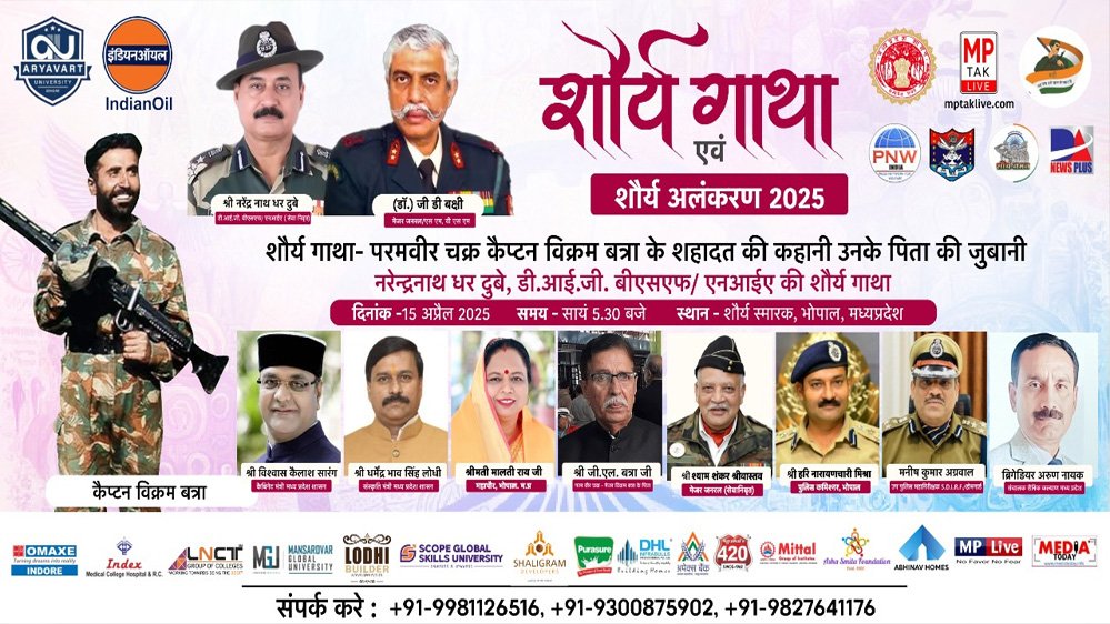 भारतीय सैन्य शौर्य, बलिदान और देशभक्ति की गाथाओं को जनमानस तक पहुँचाने के उद्देश्य से आयोजित होने जा रहा है एक गौरवशाली आयोजन  "शौर्य गाथा एवं शौर्य अलंकरण- 2025", जो दिनांक 15 अप्रैल 2025 को शौर्य स्मारक, भोपाल (म.प्र.) में आयोजित किया जाएगा। यह कार्यक्रम सायं 5:30 बजे प्रारंभ होगा।