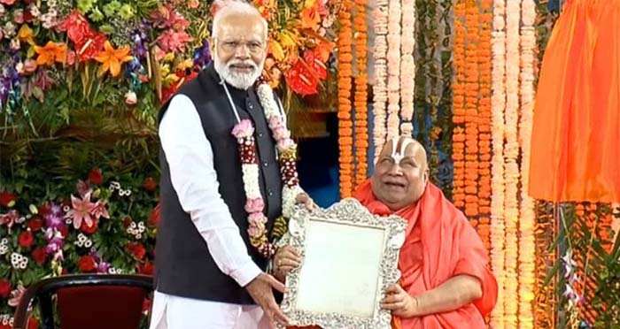 इसके बाद प्रधानमंत्री तुलसी पीठ सेवा न्यास तुलसी पीठाधीश्वर जगद्गुरु स्वामी रामभद्राचार्य महाराज के कार्यक्रम स्थल पर पहुंचे। उन्होंने स्व. अरविंद भाई मफतलाल जी के जन्म शताब्दी समारोह में भी शिरकत की। प्रधानमंत्री ने स्व. अरविंद भाई मफतलाल के जन्म शताब्दी समारोह में अपने संबोधन में कहा कि चित्रकूट के श्रीसद्गुरु सेवासंघ आना मेरे लिए सौभाग्य की बात है। उन्होंने कहा कि चित्रकूट वह अलौकिक क्षेत्र है, जिसके बारे में संतों ने कहा कि यहां प्रभु श्रीराम के साथ सीता माता और लक्ष्मण का नित्य निवास है। इस दौरान प्रधानमंत्री ने अरविंद भाई मफतलाल का फोटोयुक्त डाक टिकट जारी किया।