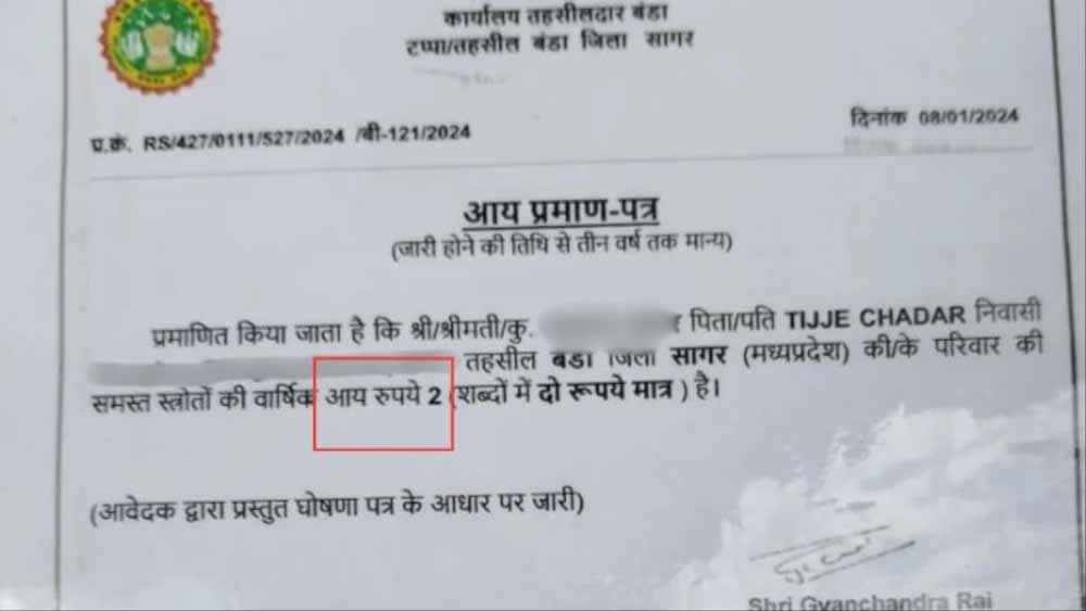 सागर के बंडा तहसील में आय प्रमाणपत्र जारी करते समय भारी लापरवाही बरती गई। दरअसल यहां के एक छात्र ने जनवरी 2024 को अपना आय प्रमाण पत्र बनवाया था। इसमें तहसील कार्यालय द्वारा उसके परिवार की वार्षिक आय दो रुपये होने का प्रमाणपत्र जारी कर दिया गया। अब यह परिवार इस प्रमाणपत्र में संसोधन कराना चाहता है। इस बीच उसका प्रमाणपत्र सोशल मीडिया पर वायरल हो गया।